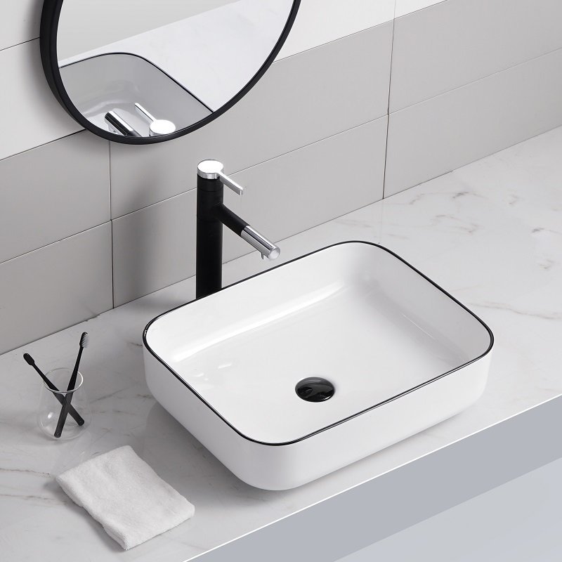 Complétez votre salle de bain avec cette vasque à poser rectangulaire en céramique blanc et noir 50 cm.