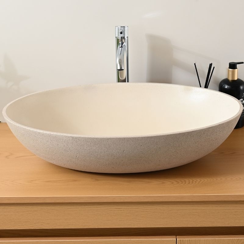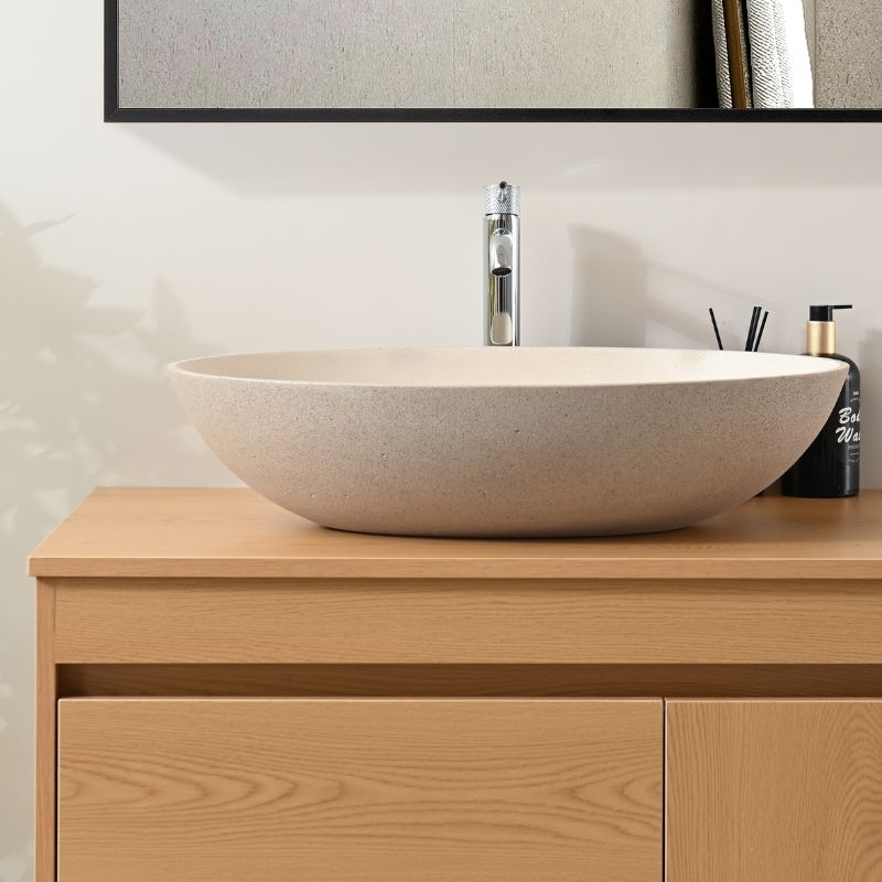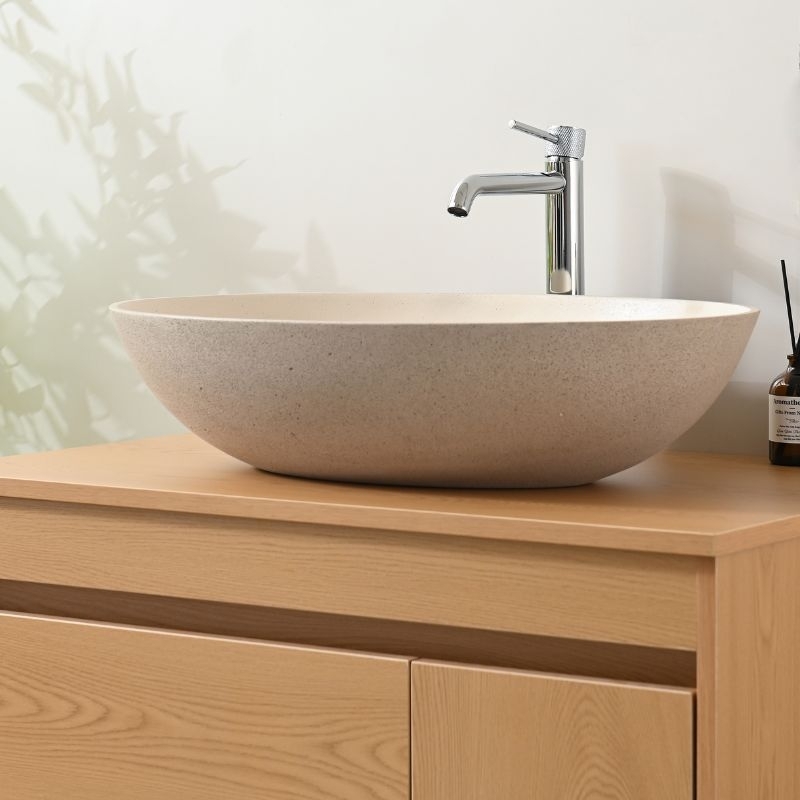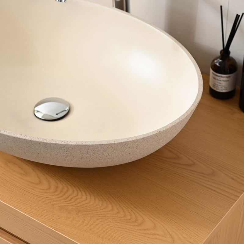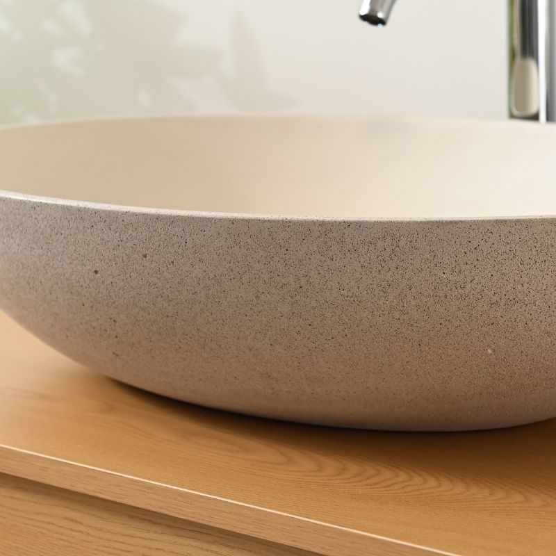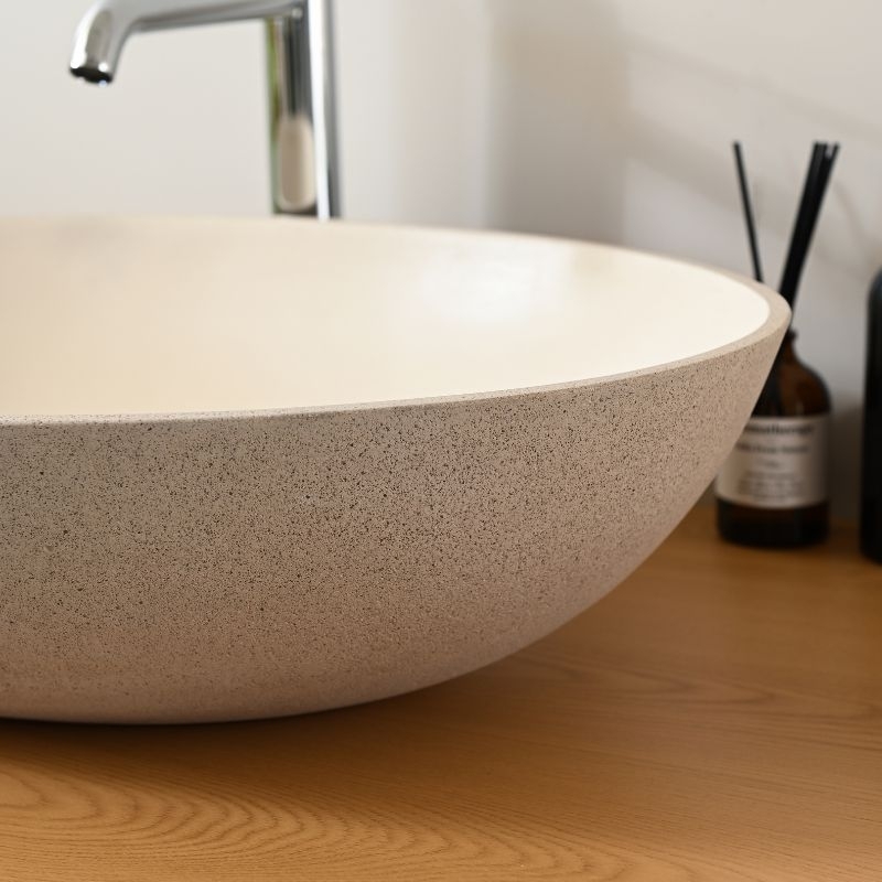 La vasque à poser Coffi 59 cm incarne une approche naturelle et durable de la salle de bain, mêlant béton recyclé, pierre naturelle et véritable café pour une teinte authentique.
