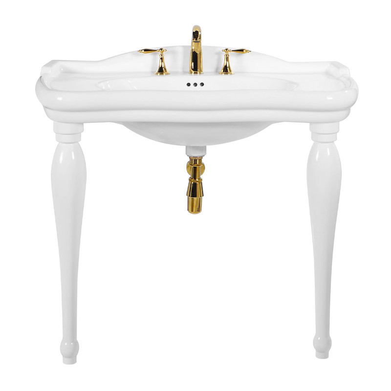 La vasque mouluré d'époque en céramique émaillée blanche brillante, possède trois orifices prévus pour un robinet de type mélangeur (équipé d'un bec verseur et d'une manette eau chaude et d'une manette eau froide). De plus, le trop-plein intégré dans la vasque garantit une expérience sans tracas et sans débordement.
