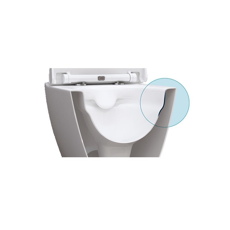 Contrairement aux cuvettes de toilette traditionnelles avec bride, la cuvette Joy sans bride ne présente pas de recoins où les bactéries et les résidus peuvent s'accumuler.