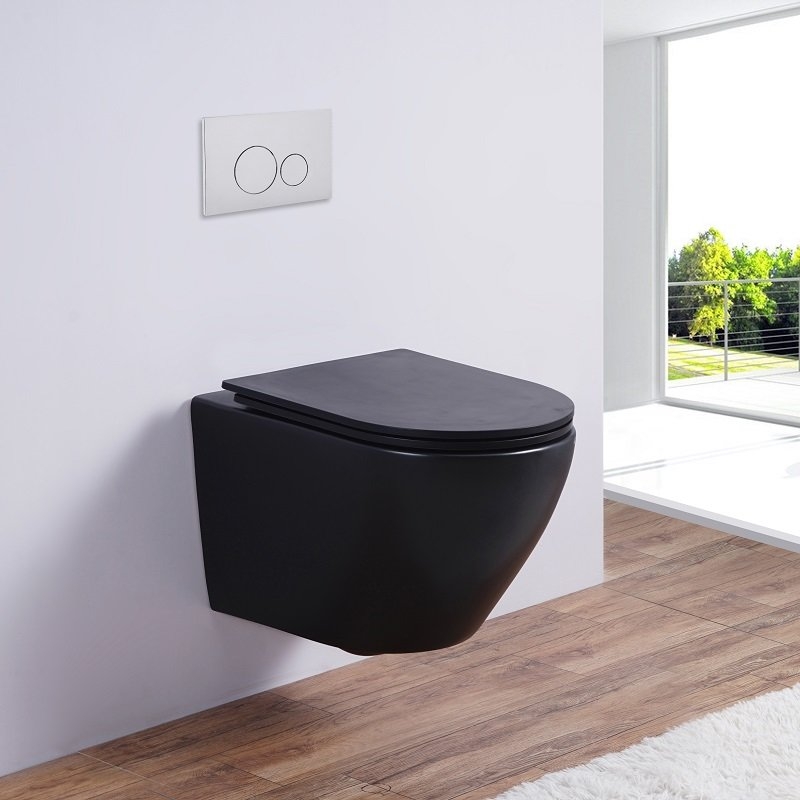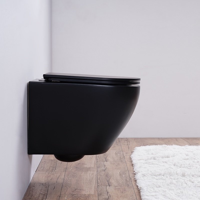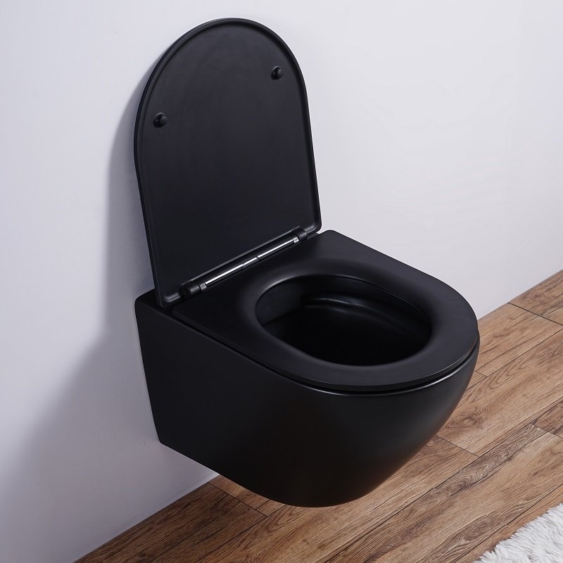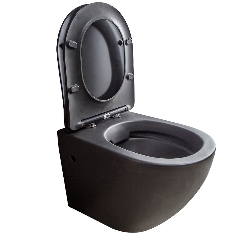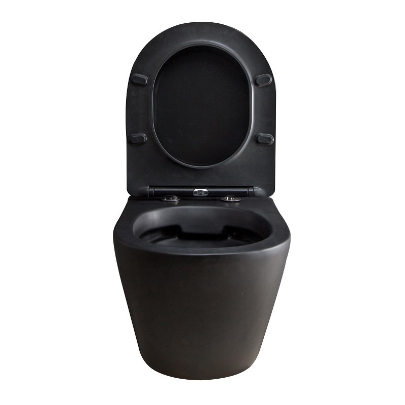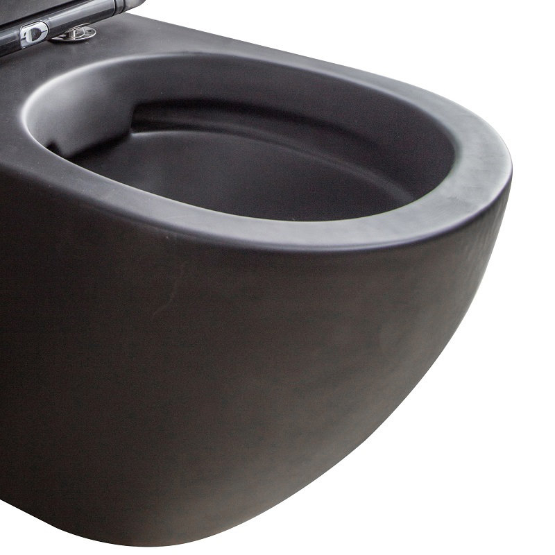 La cuvette suspendue Joy en noir mat marie élégance et hygiène. Son design rimless élimine les bactéries et le tartre, assurant un écoulement de l'eau sans éclaboussures, facilité par son traitement antibactérien et anticalcaire.